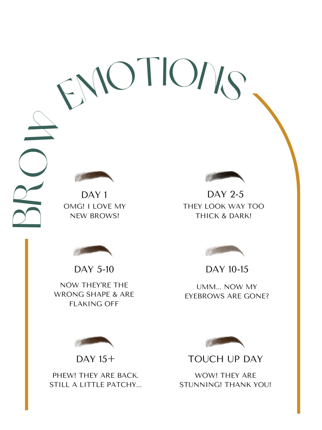 Around day 3, you might notice flaking or light scabbing—do not pick at it, as this can cause pigment loss. Brows may look spotty or patchy until fully healed. Some areas may appear very light or seem to have lost pigment after peeling. This is due to a thicker epidermis that can mute or diffuse the pigment underneath. Over the next 4–6 weeks, the epidermis will normalize, and the softened pigment should become clearer on the skin’s surface.